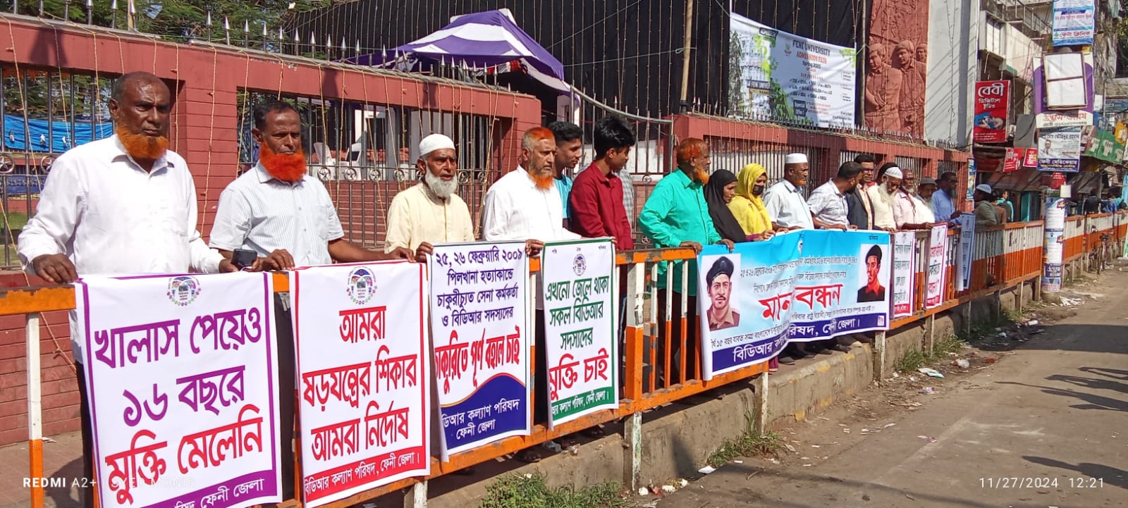 ফেনীতে বিডিআর বিদ্রোহে নিরঅপরাধ জেলবন্দী বিডিআর সদস্যদের মুক্তি ও পুনরায় চাকরির দাবিতে মানববন্ধন