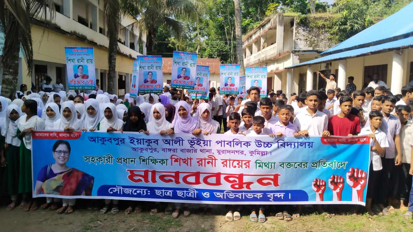 মুরাদনগরে শিক্ষার্থীদের মামলা প্রত্যাহার ও শিক্ষকের পদত্যাগ দাবিতে মানববন্ধন