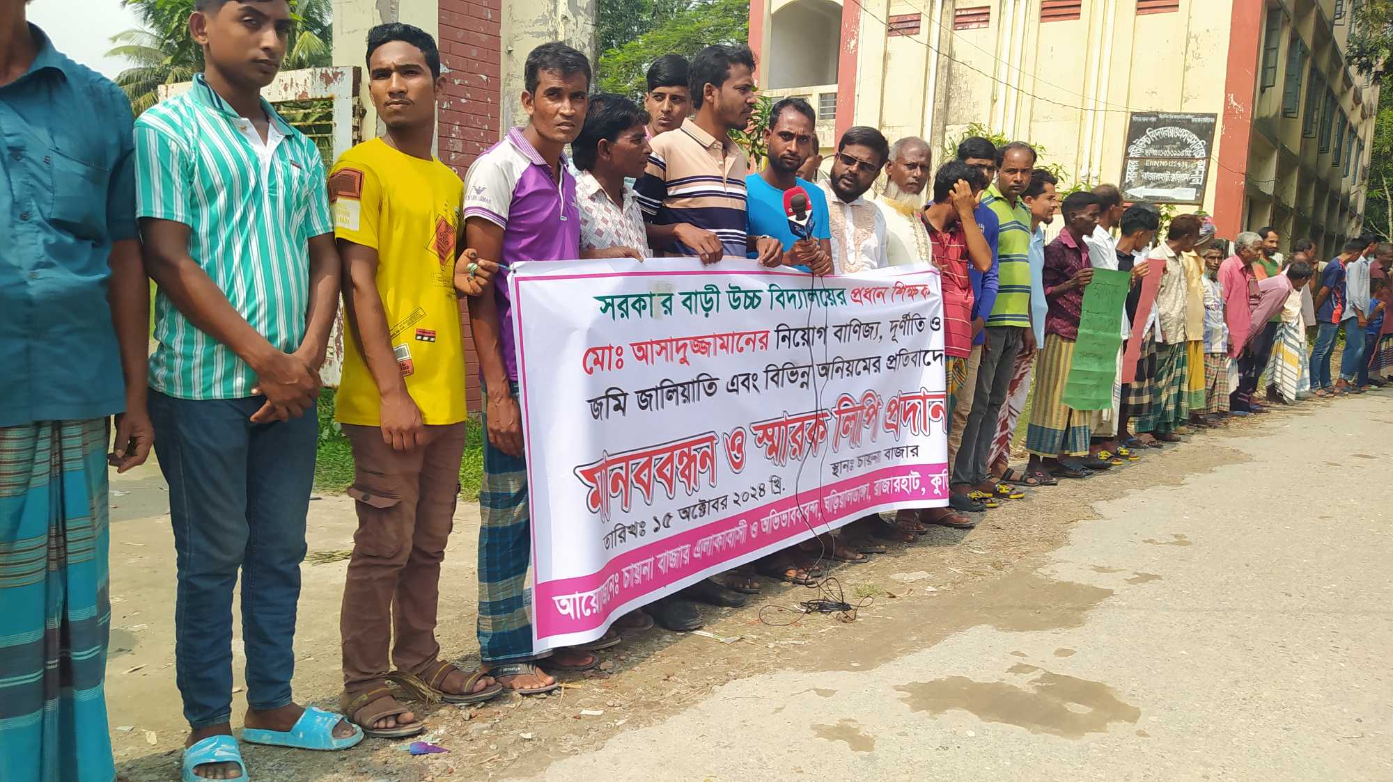রাজারহাটে প্রধান শিক্ষকের অনিয়ম ও জালিয়াতির অভিযোগে মানববন্ধন
