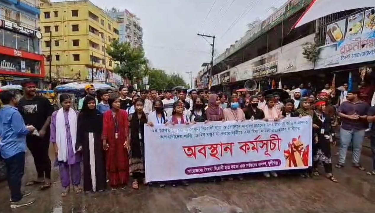 মুন্সীগঞ্জে অপরাধীদের বিচার ও মিথ্যা মামলা প্রত্যাহারের দাবীতে আদালত প্রাঙ্গনে ছাত্রদের অবস্থান