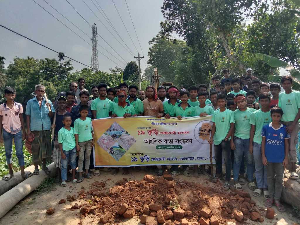 পথচারীদের ভোগান্তি নিরসনে মান্দায় ১৯ কুড়ি স্বেচ্ছাসেবী সংগঠনের উদ্যোগে রাস্তা সংস্কার