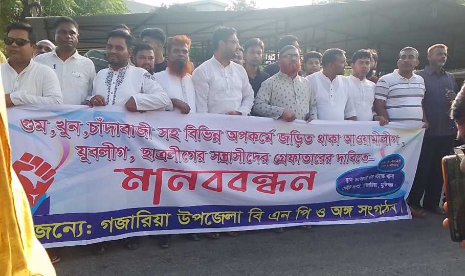 গুম,খুন সহ বিভিন্ন অপকর্মে জড়িত আঃলীগ সন্ত্রাসীর গ্রেফতারের দাবিতে মানববন্ধন