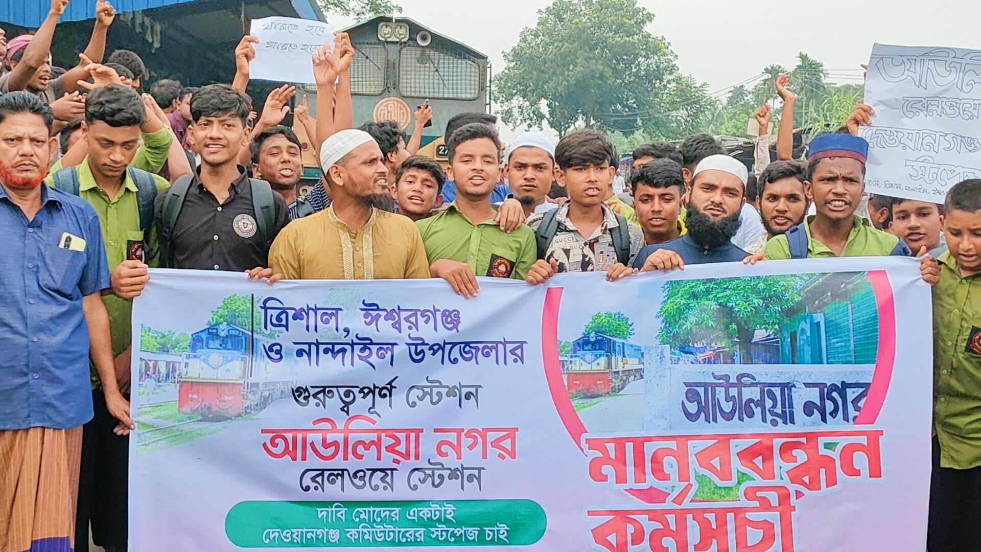 ত্রিশালে ট্রেন স্টপেজের দাবীতে বিক্ষোভ ও ট্রেন চলাচল বন্ধ