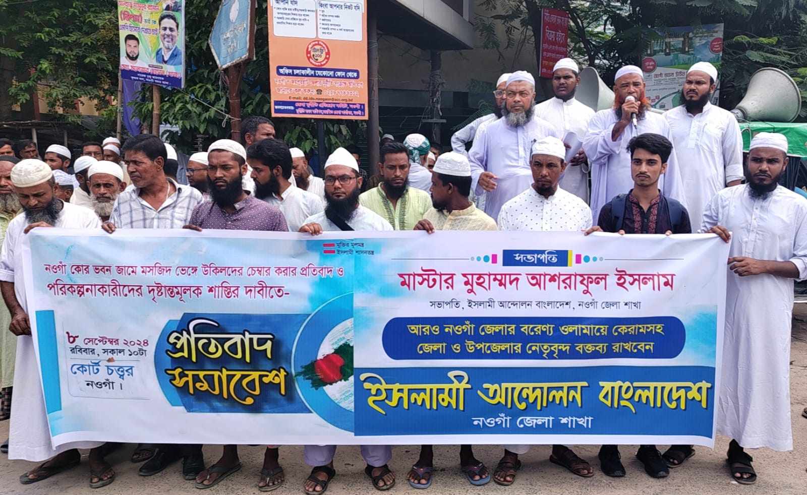 কোর জামে মসজিদ ভেঙ্গে অ্যাডভোকেটদের অফিস বানানোর প্রতিবাদে নওগাঁয় মানববন্ধন।