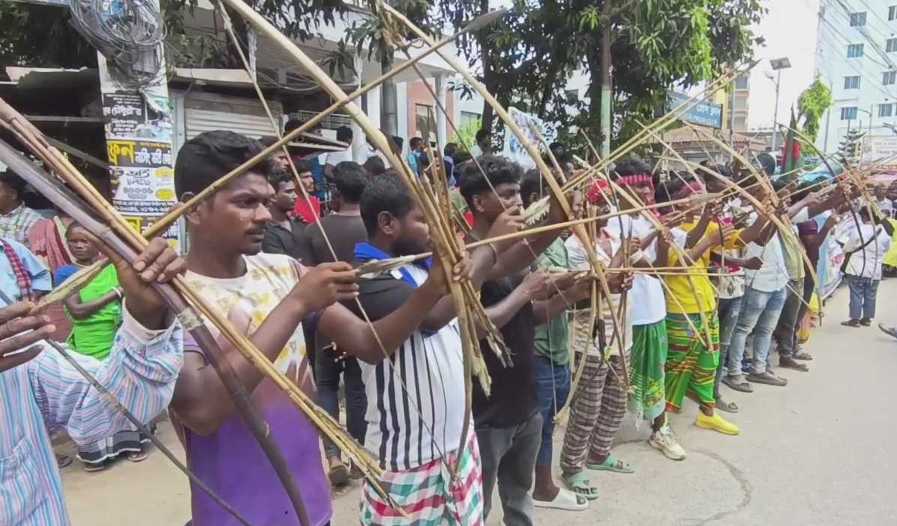 তীর ধনুক হাতে নিয়ে রাস্তায় নেমেছে সাঁওতালরা