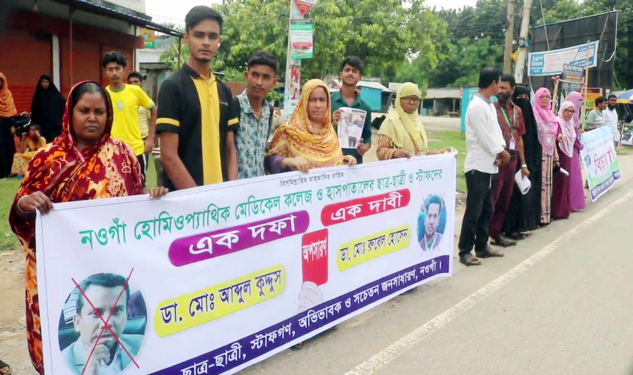 নওগাঁয় শিক্ষকের দুর্নীতির প্রতিবাদে শিক্ষার্থীদের মানববন্ধন।
