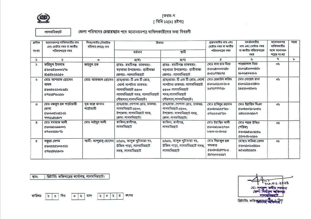 লালমনিরহাট জেলা পরিষদের চেয়ারম্যান পদের উপ-নির্বাচনে ৫ জনের মনোনয়নপত্র জমা