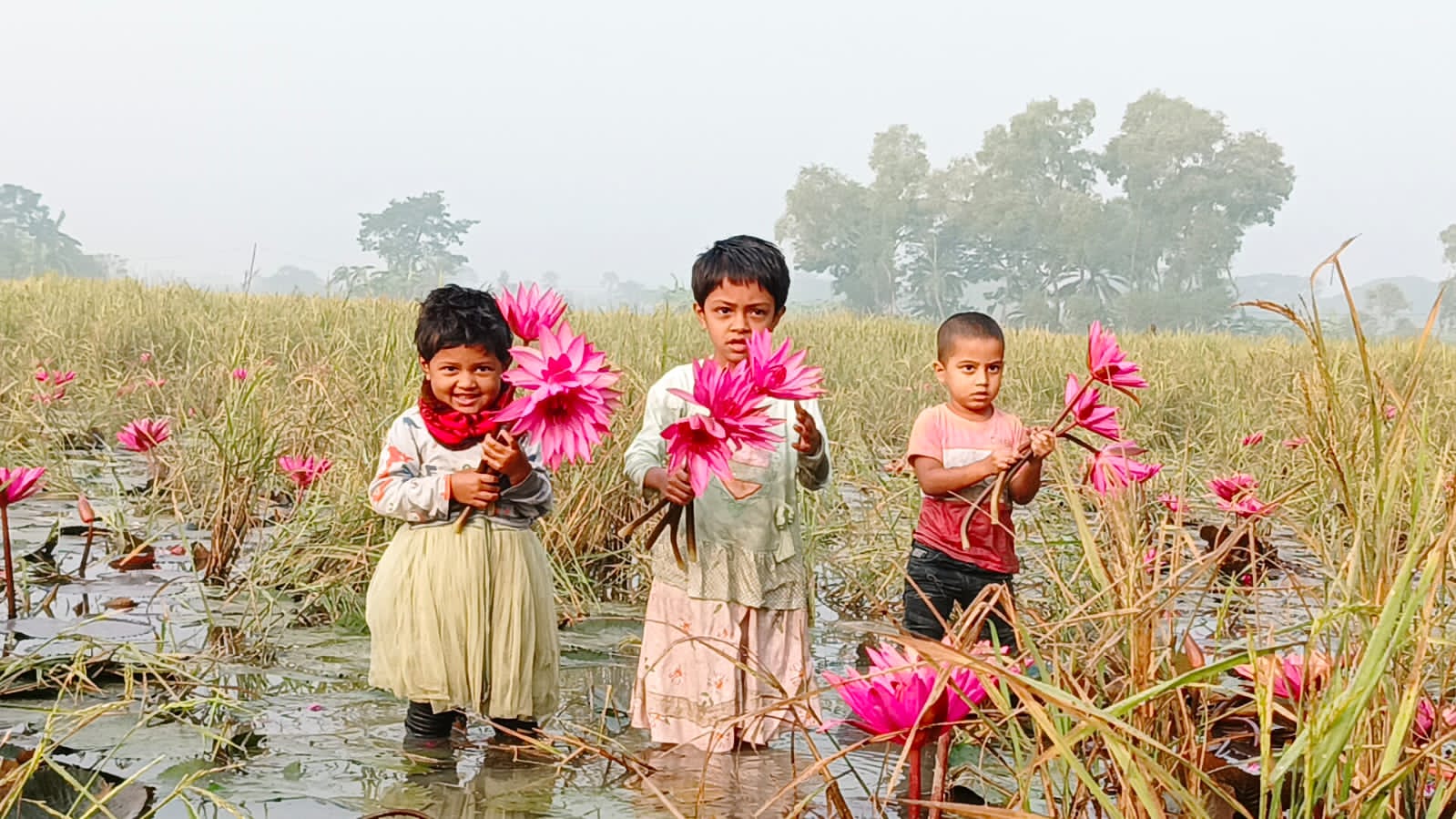 ধান ক্ষেতে শাপলা ফুলের সমাহার, সৌন্দর্য উপভোগে শিশুরা