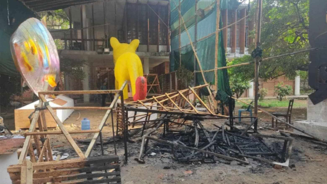 মুক্তিযুদ্ধ স্মৃতিস্মারক মঞ্চের ম্যুরাল কাপড় দিয়ে ঢেকে স্বাধীনতা দিবস পালন করায় চলছে তীব্র প্রতিক্রিয়া
