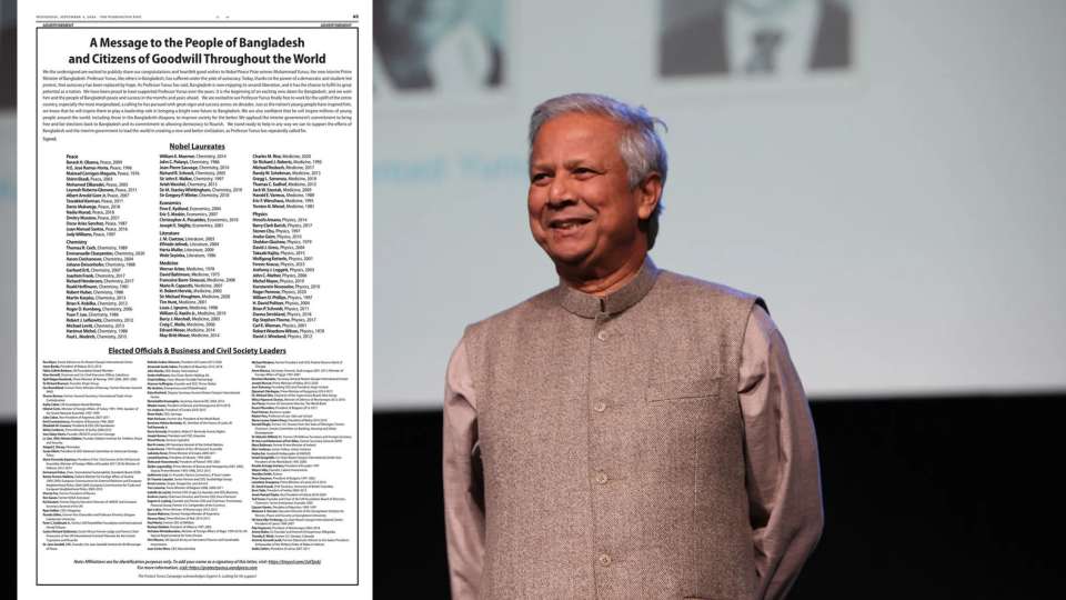 ড. ইউনূসকে শুভেচ্ছা জানিয়ে ওবামাসহ ৯২ নোবেলজয়ীর চিঠি