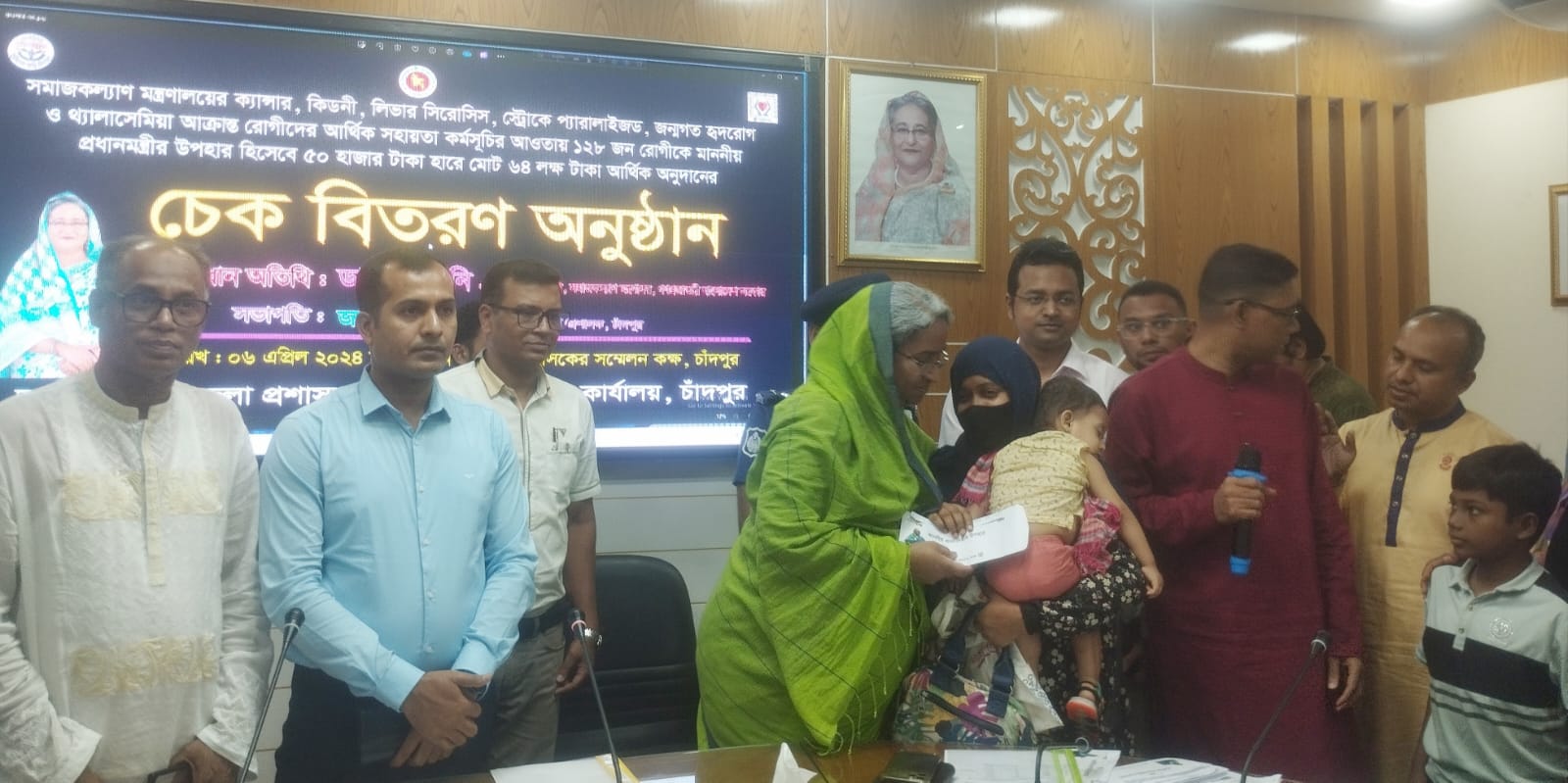 চাঁদপুরে সমাজকল্যাণ মন্ত্রণালয়ের অধীন ক্যান্সার, কিডনী, লিভার সিরোসিস, স্ট্রোকে প্যারালাইজড, জন্মগত হৃদরোগ ও থ্যালাসেমিয়া আক্রান্ত রোগীদের আর্থিক সহায়তা কর্মসূচির আওতায়