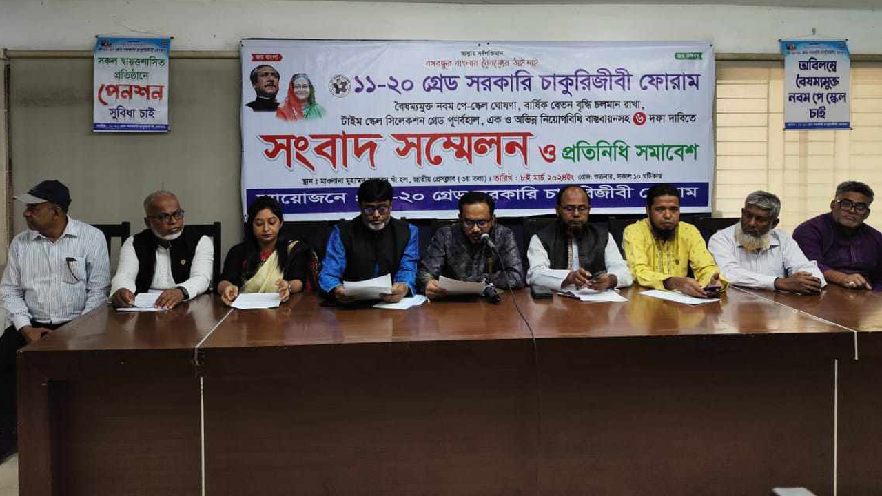 বৈষম্যমুক্ত নবম পে-স্কেল ঘোষণা, বার্ষিক বেতন বৃদ্ধি চলমান রাখাসহ ছয় দফা দাবিতে সংবাদ সম্মেলন করেছে ১১-২০ গ্রেড সরকারি চাকরিজীবী ফোরাম।