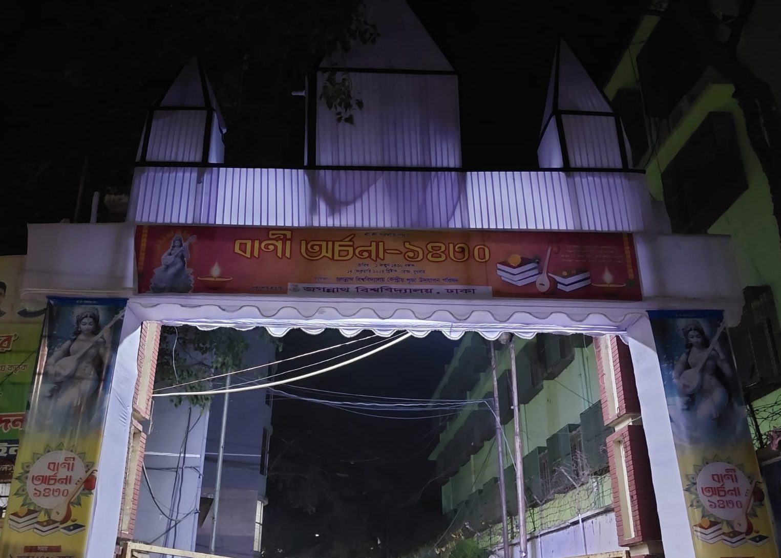 জগন্নাথ বিশ্ববিদ্যালয়ের (জবি) প্রধান ফটক ও নামফলক সরস্বতী পূজার জন্য তৈরি করা গেট দিয়ে ঢেকে ফেলা হয়েছে। এর ফলে বাইরে