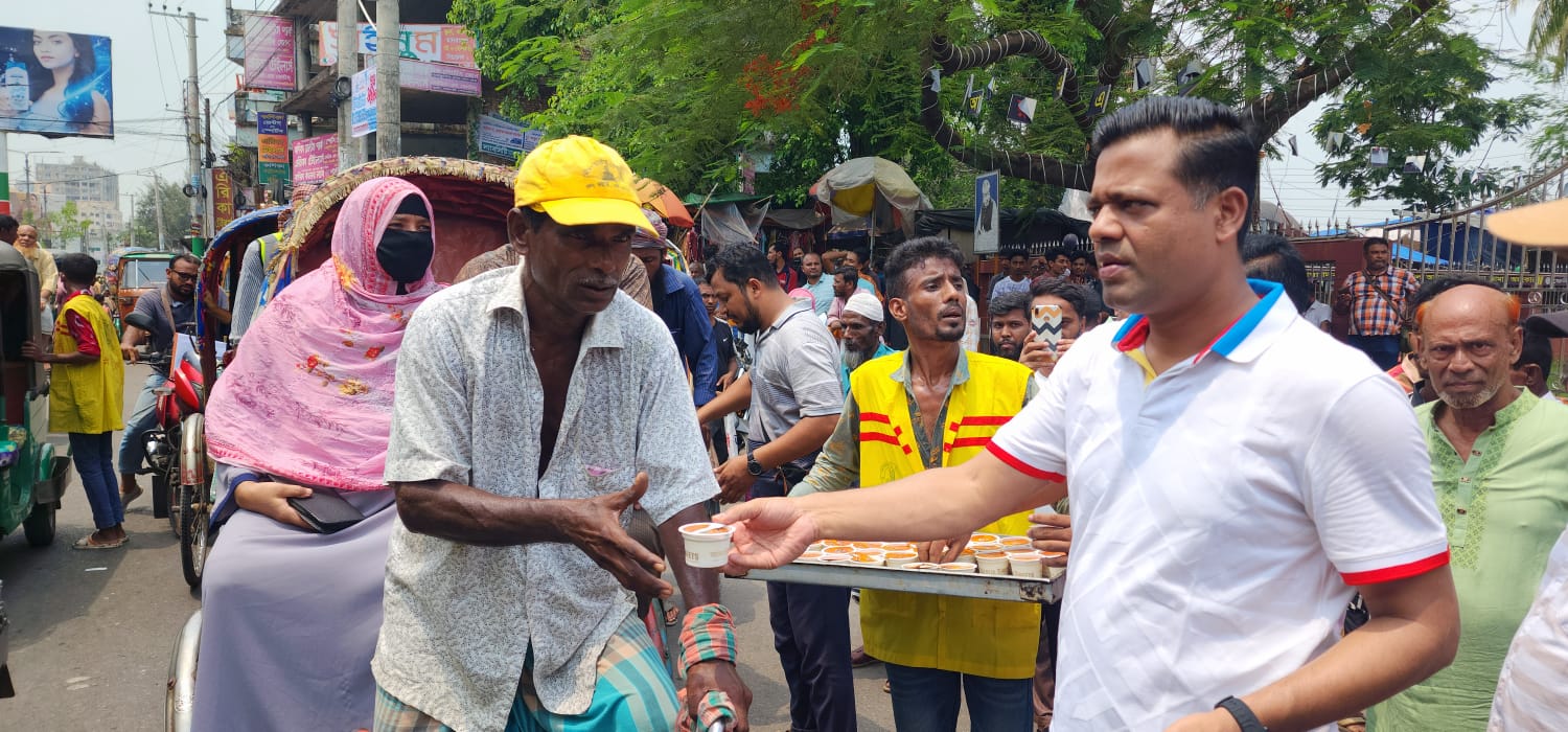তীব্র তাপদাহের কারণে পথচারীদের মাঝে শরবত ও খাবার পানি বিতরণ