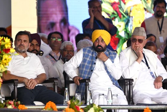 নয়াদিল্লির রামলীলা ময়দানে আয়োজিত ইন্ডিয়া জোটের জনসভা মঞ্চে (বাঁ থেকে) কংগ্রেস নেতা রাহুল গান্ধী, পাঞ্জাবের মুখ্যমন্ত্রী বলবন্ত সিং মান ও