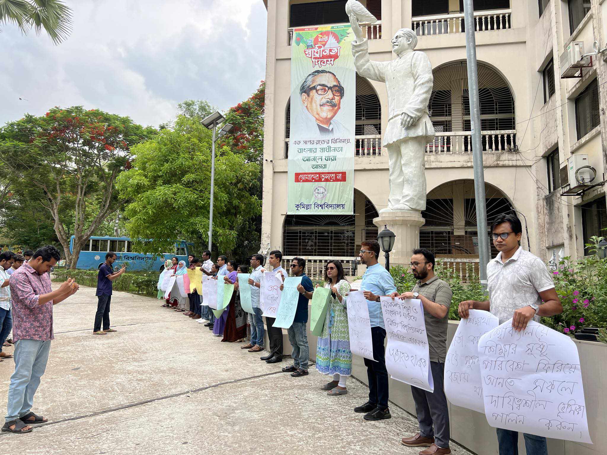 সাম্প্রতিক সময়ের বিভিন্ন ঘটনার প্রতিবাদে কুমিল্লা বিশ্ববিদ্যালয়ের বিভিন্ন বিভাগের শিক্ষকরা মৌন মানববন্ধন কর্মসূচি পালন করেছে। রবিবার (১২ মে) বিকাল ৩টা