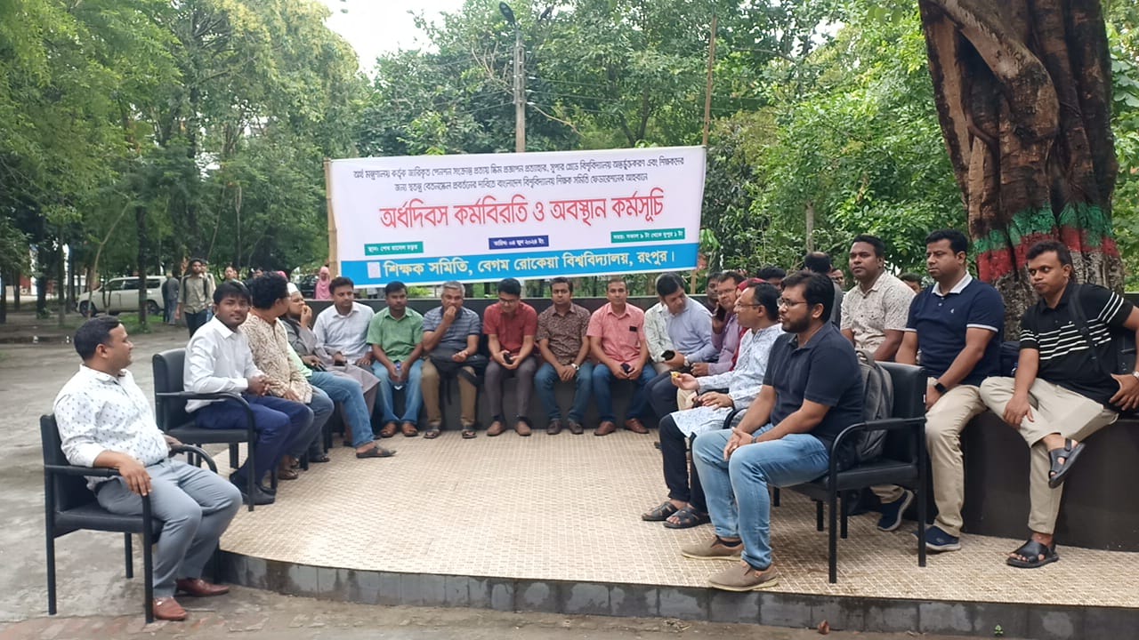 সরকারের অর্থ মন্ত্রণালয় কর্তৃক জারিকৃত পেনশন সংক্রান্ত প্রত্যয় স্কিম প্রজ্ঞাপন প্রত্যাহার, সুপার গ্রেডে বিশ্ববিদ্যালয় অন্তর্ভুক্তকরণ এবং শিক্ষকদের জন্য স্বতন্ত্র বোতন স্কেল প্রবর্তনের তিনদফা দাবিতে অর্ধদিবস কর্মবিরতি পালন করেছে বেগম রোকেয়া বিশ্ববিদ্যালয় (বেরোবি) শিক্ষক সমিতি। আজ মঙ্গলবার (৪ জুন) সকাল ৯টা থেকে দুপুর ১ টা পর্যন্ত বিশ্ববিদ্যালয়ের শেখ রাসেল মিডিয়া চত্বরে অবস্থান নিয়ে অর্ধদিবস কর্মবিরতি পালন করে শিক্ষকরা। এ সময় বিশ্ববিদ্যালয়ের বিভিন্ন বিভাগের শতাধিক শিক্ষক উপস্থিত ছিলেন। তবে পরীক্ষাসমূহ এ কর্মসূচির আওতামুক্ত ছিল। বিশ্ববিদ্যালয় শিক্ষক সমিতির সাধারণ সম্পাদক সহযোগী অধ্যাপক আসাদুজ্জামান মন্ডল আসাদের সঞ্চালনায় এবং শিক্ষক সমিতির সভাপতি অধ্যাপক ড. বিজন মোহন চাকীর সভাপতিত্বে কর্মবিরতিতে বক্তারা বলেন, প্রত্যয় স্কিমটি নামে সর্বজনীন হলেও আদৌতে সর্বজনীন নয়। সরকারের তিনটি গুরুত্বপূর্ণ প্রতিষ্ঠান―সামরিক ও বেসামরিক আমলাতন্ত্র ও বিচার বিভাগকে এই প্রক্রিয়ার বাইরে রেখে একে সর্বজনীন বলার সুযোগ নেই। স্কিমটি যদি সত্যিই সর্বজনীন হয়ে থাকে তবে একে অধিকতর সর্বজনীন করার জন্য সামরিক-বেসামরিক আমলাতন্ত্র ও বিচার বিভাগকেও এর আওতায় আনা হোক। তা না হলে তড়িঘড়ি করে জারি করা এই অন্যায্য ও বৈষম্যমূলক স্কিম অবিলম্বে বাতিল করা হোক। বক্তারা আরো বলেন, এই প্রজ্ঞাপন জাতির পিতা বঙ্গবন্ধু শেখ মুজিবুর রহমান-এর শিক্ষা দর্শনের প্রতি চরম অবমাননা। দেশ স্বাধীনতা লাভের পরে জাতির পিতা বঙ্গবন্ধু শেখ মুজিবুর রহমান বিশ্ববিদ্যালয়সহ গবেষণা প্রতিষ্ঠানসমূহকে স্বায়ত্বশাসন প্রদান করে শিক্ষা ও গবেষণাকে মর্যাদার আসনে অধিষ্ঠিত করেছিলেন। শিক্ষকদের প্রতি সর্বোচ্চ সম্মান প্রদর্শন করেছিলেন; এরই ধারাবাহিকতায় আরো স্বায়ত্বশাসিত বিশ্ববিদ্যালয় প্রতিষ্ঠা লাভ করে।অর্থ মন্ত্রণালয় থেকে জারিকৃত বৈষম্যমূলক প্রজ্ঞাপন সরকারী বিশ্ববিদ্যালয়ের সঙ্গে কখনই যায় না। বিশ্ববিদ্যালয়ের শিক্ষকদের এ প্রতিবাদ নীতি নির্ধারকসহ প্রধানমন্ত্রী পর্যন্ত পৌঁছাবে এবং বৈষম্যমূলক এ ধরনের হঠকারী সিদ্ধান্ত প্রত্যাহার করা হবে। সেইসাথে বিশ্ববিদ্যালয় শিক্ষকদের আলাদা স্বতন্ত্র বেতনকাঠানো প্রণয়নসহ যাবতীয় সুযোগ-সুবিধা দিতে হবে। বক্তারা আরো বলেন, বিশ্ববিদ্যালয়ের একটি নিজস্ব পরিচয় রয়েছে, নিজস্ব সিন্ডিকেট রয়েছে, সিনেট রয়েছে। অর্থ মন্ত্রণালয় থেকে জারিকৃত বৈষম্যমূলক প্রজ্ঞাপন সরকারী বিশ্ববিদ্যালয়ের সঙ্গে কখনই যায় না। আমরা আশা করি, বিশ্ববিদ্যালয়ের শিক্ষকদের এ প্রতিবাদ নীতি নির্ধারকসহ প্রধানমন্ত্রী পর্যন্ত পৌঁছাবে এবং বৈষম্যমূলক এ ধরনের
