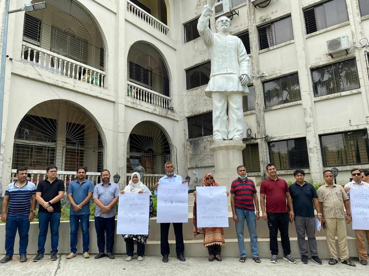 চট্টগ্রাম বিশ্ববিদ্যালয় শিক্ষক সমিতির শিক্ষকগণ অর্থ মন্ত্রণালয় কর্তৃক সম্প্রতি জারিকৃত পেনশন সংক্রান্ত বৈষম্যমূলক প্রজ্ঞাপন প্রত্যাহারের দাবিতে অর্ধদিবস কর্মবিরতি পালন করছেন।